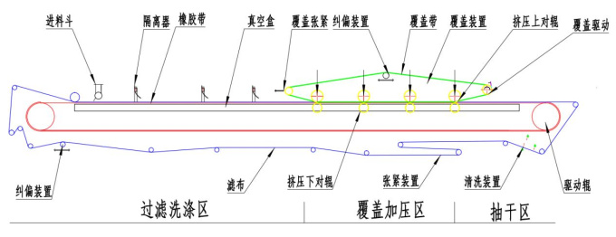 環(huán)形過濾膠帶由電機經減速驅動連續(xù)運行,濾布鋪敷在膠帶上與之同步運行。膠帶與真空室滑臺接觸(真空室與膠帶間有環(huán)形磨擦帶并通入水形成水密封),當真空室接通真空系統(tǒng)時,在膠帶上形成真空,料漿由布料器均勻地布在濾布上,在真空的作用下,濾液穿過濾布經膠帶上的橫溝槽匯總并由膠帶中心小孔進入真空室,固體顆粒被截留而形式濾餅;進入真空的液體經氣水分離器排出。隨著橡膠帶移動已形成的濾餅依次進入濾餅抽濾區(qū)、覆蓋區(qū)、抽干區(qū);在上下濾布共同包裹下,形成高真空區(qū)域,抽出濾餅中的水分,同時在覆蓋區(qū)有擠壓輥與對輥,在氣缸高壓力線接觸作用下擠壓濾餅,去除濾餅水份;經過抽干區(qū)進一步脫水,濾布與膠帶分開,在卸濾餅輥處將濾餅卸出;卸除濾餅的濾布經清洗后獲得再生;再經過一組支承輥和糾偏裝置后重新進入過濾區(qū)。