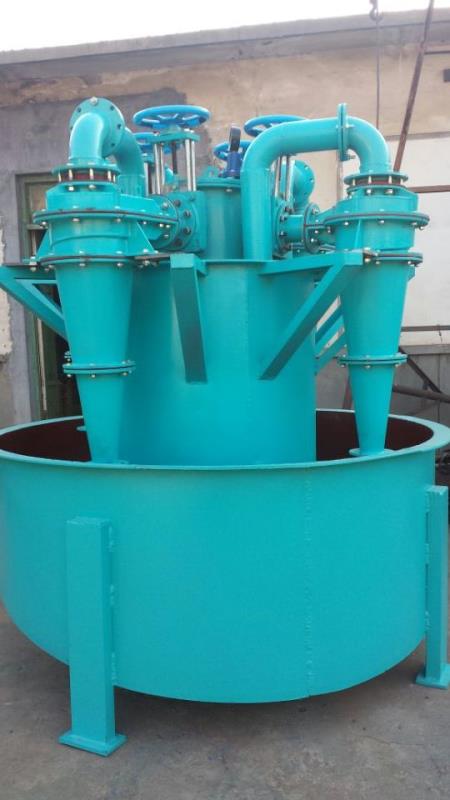給料料漿在壓力作用下沿線方向進入旋流器,在離心力場作用下,大顆粒被拋向器壁,隨外旋流向下運動,從下部沉砂口排出,得到粒度粗的沉砂產(chǎn)物,細顆粒隨內(nèi)旋流向上運動,從上部溢流管得到粒度細的溢流產(chǎn)物。